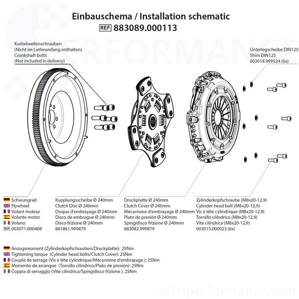 O disco de embraiagem de mola de torção SACHS Racing incluído no kit de embraiagem 883089.000113 amortece as vibrações do motor e protege a transmissão do seu veículo. Os discos de embraiagem com mola da SACHS Racing estão equipados com amortecedores de torção mais fortes para poderem transmitir um binário máximo do motor mais elevado. Devido à redução da massa e à ligação mais rígida resultante da omissão do volante original de dupla massa, não é de excluir uma maior transmissão de ruído e vibrações da transmissão.
