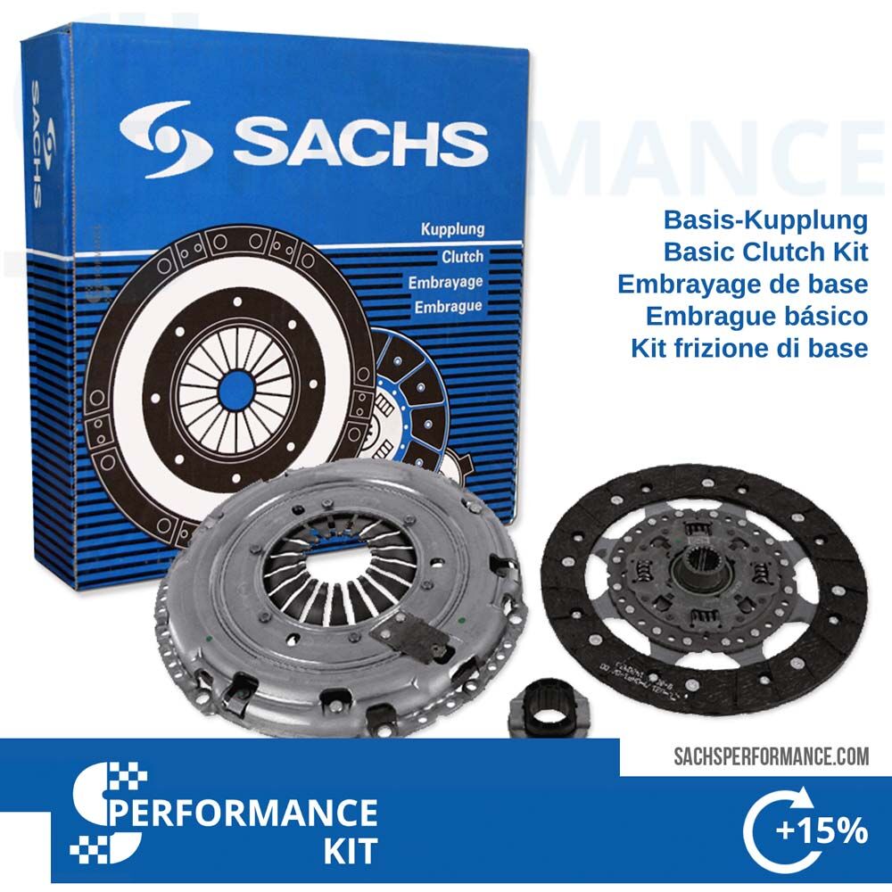 Inkluderar SACHS-kopplingstryckplattan, kopplingslamell med Performance-kopplingsbeläggning och SACHS urtrampningslager.
