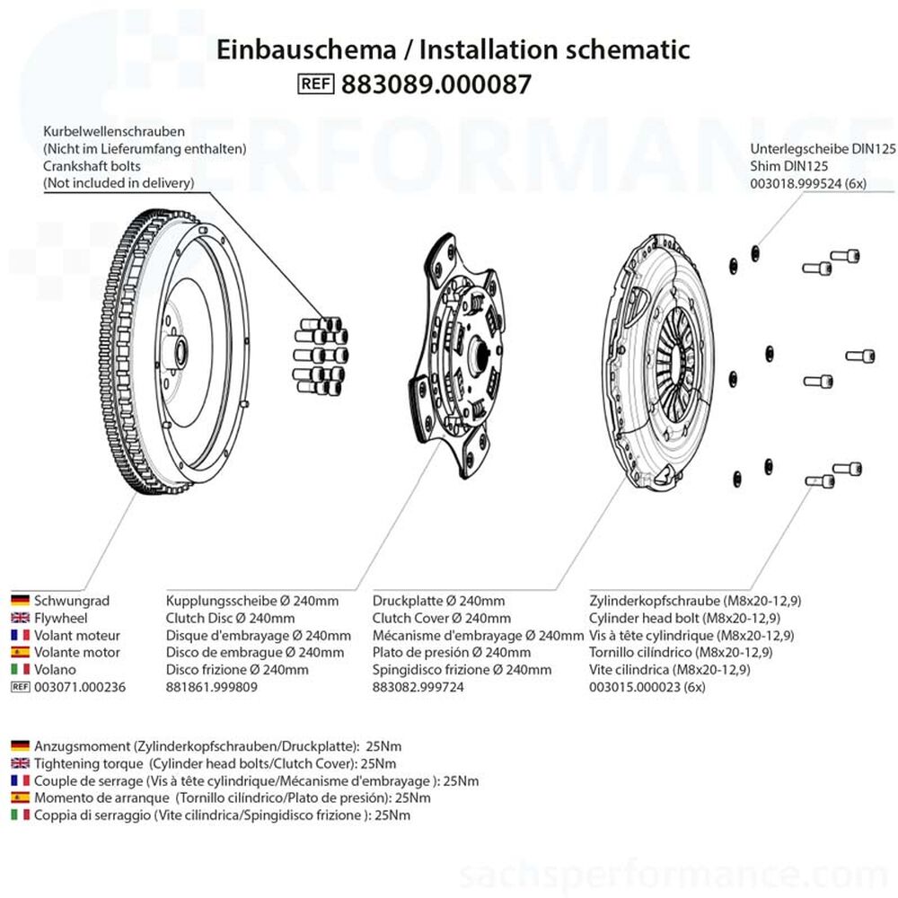 Den torsionsfjädrade SACHS Racing-kopplingsskivan som ingår i kopplingssatsen 883089.000087 dämpar motorvibrationer och skyddar fordonets växellåda. SACHS Racing fjäderbelastade kopplingsskivor är utrustade med starkare torsionsdämpare för att kunna överföra ett högre maximalt motorvridmoment. På grund av massminskningen och den styvare anslutningen till följd av utelämnandet av det ursprungliga svänghjulet med dubbla massor kan ökad överföring av transmissionsljud och vibrationer inte uteslutas.